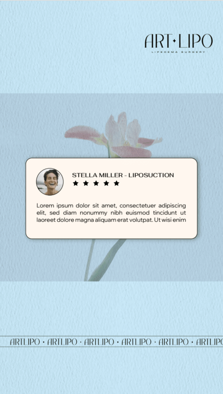 Art Lipo’s rebranding highlights positive life transformations through physical changes, not just appearances. Hand-drawn flowers symbolize growth, while a warm color palette evokes positivity.